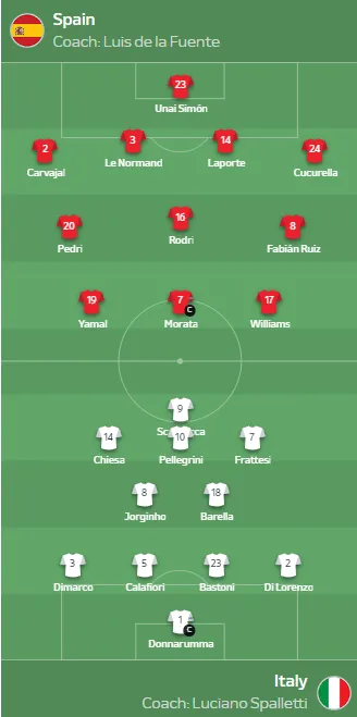 欧洲杯小组赛第二轮,西班牙对阵意大利。赛前,双方公布了首发阵容。
