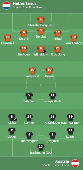 欧洲杯-荷兰vs奥地利首发:德佩、德容先发,阿拉巴、维纳尔杜姆登场