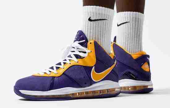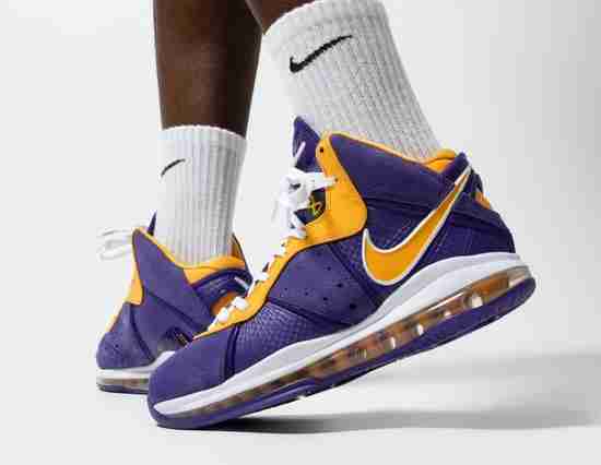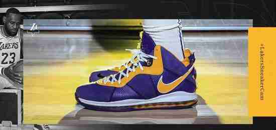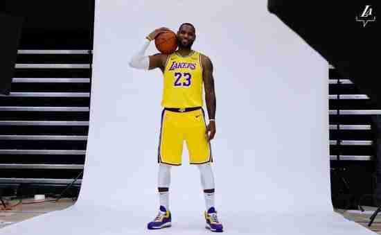 自从耐克开始复刻詹姆斯球鞋后,湖人配色就成为老詹最先上脚的复刻配色。上赛季的定妆照,老詹脚踩Nike LeBron 7,本赛季向下延顺,在拍摄定妆照时他穿上了Nike LeBron 8 “Lakers”配色。