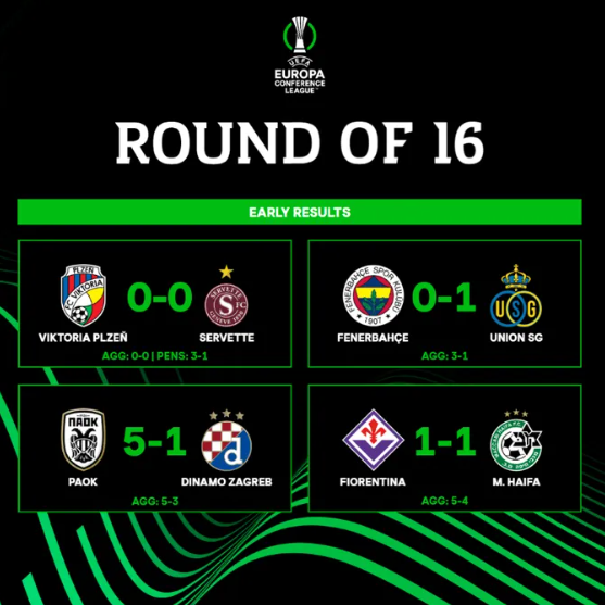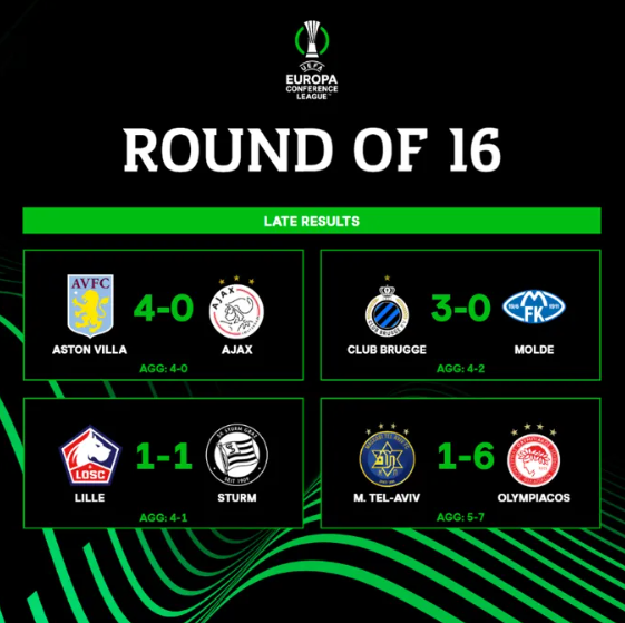 欧协联八分之一决赛第二回合结束,阿斯顿维拉、布鲁日、里尔、佛罗伦萨、塞萨洛尼基、比尔森胜利、费内巴切、奥林匹亚科斯顺利晋级八强,抽签仪式将在北京时间3月15日晚9点进行。
