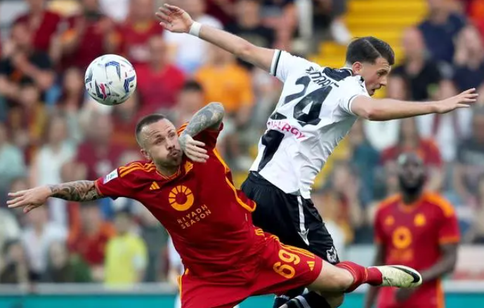 上半场,罗马在开场不久就遭遇了打击。第23分钟,罗马小将怀森面对高空球处理失误,罗伯特·佩雷拉抢断后单刀直入,将球打入空门,罗马0-1落后乌迪内斯。然而,罗马并未因此气馁,他们在接下来的比赛中努力寻找机会。