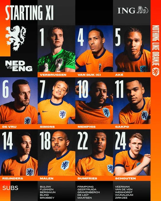 07月11日 欧洲杯半决赛最后一场,荷兰对阵英格兰,赛前双方公布了各自的首发名单。本场比赛的胜者将进入决赛对决西班牙队。