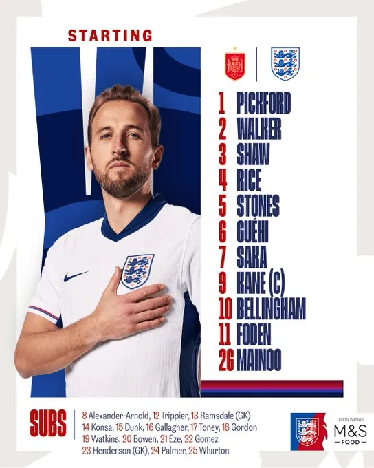 024欧洲杯决赛,西班牙对决英格兰 公布了首发名单!...